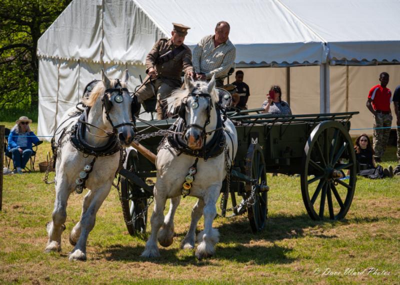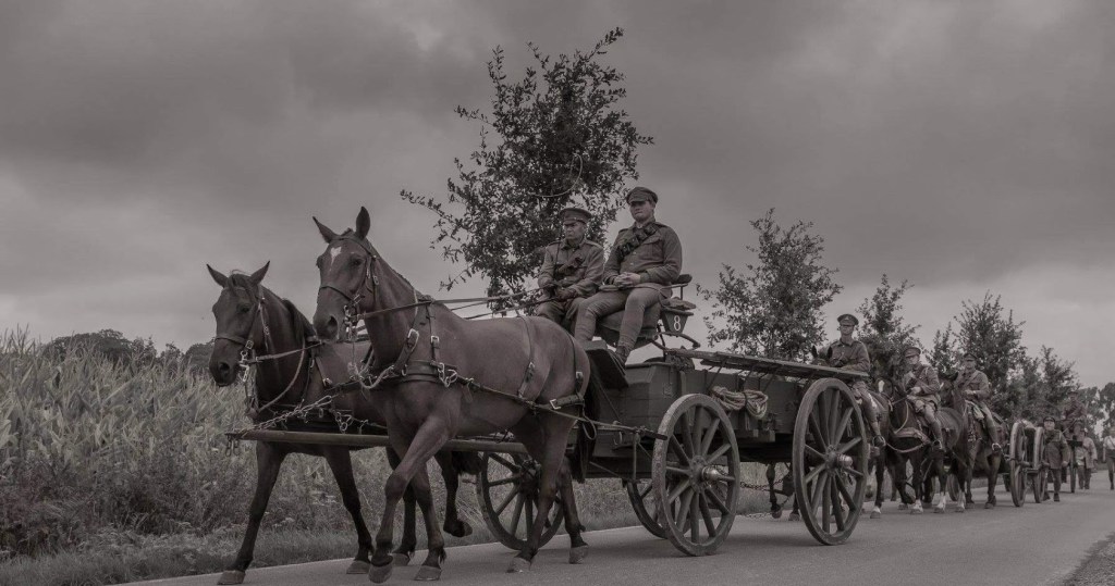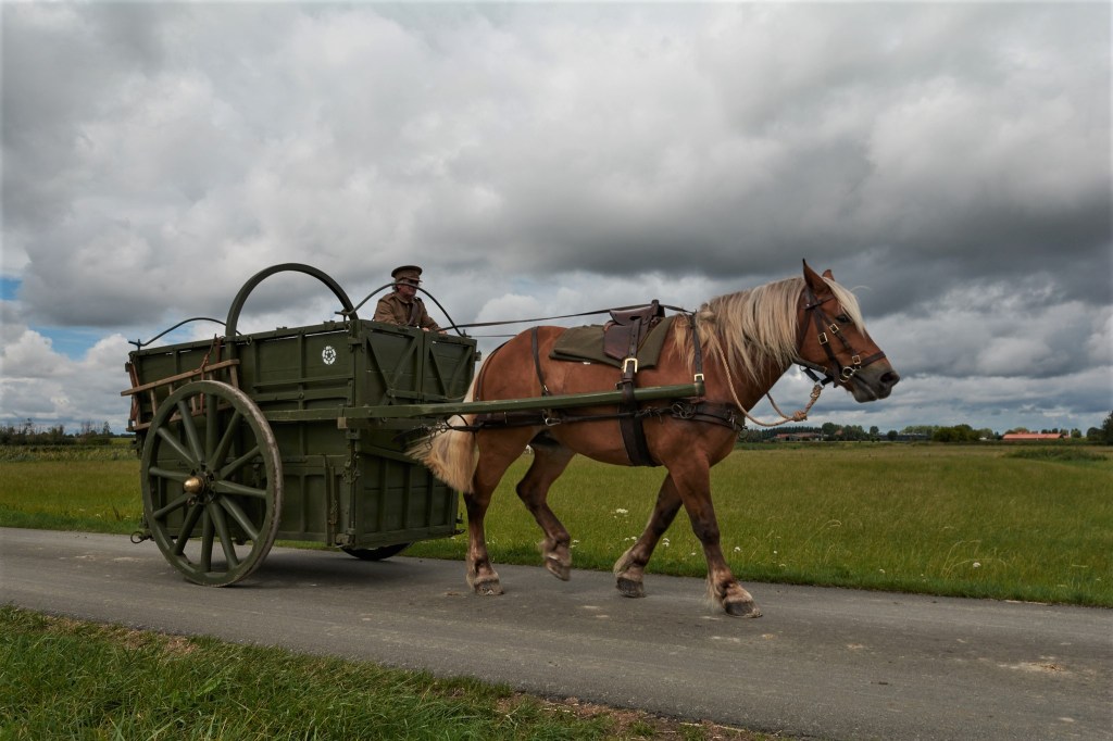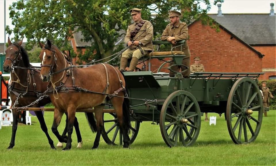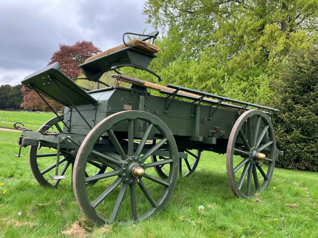A limbered wagon is a lightweight articulated vehicle designed for off-road use over uneven ground – essentially two carts linked by a short pole or perch. Each part, fore and hind can carry about half a ton and could, if necessary, be used separately as a single unit. Normally drawn by two horses, the driver seated on the nearside horse or mule, additional pairs could be added when the going got tough. Although it could not carry the load that a GS wagon can, it is much more manoeuvrable and became the preferred vehicle for mobile units, with several variants for artillery and small-arms ammunition, engineer tools etc. and general stores. Each battery, infantry battalion, Royal Engineers and Machine Gun Corps Company would have a number of specialised limbered wagons. Most were unsprung, but some earlier models with provision for carrying personnel had springs to ease the ride and draught. These were found liable to break with heavy use and all later versions were unsprung.